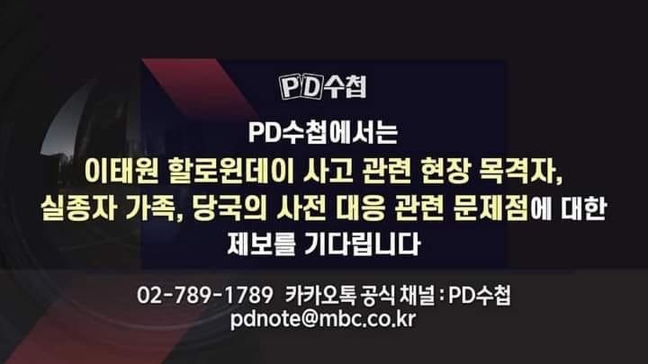 MBC PD수첩 "할로윈데이 사고, 사전대응 문제점 제보받는다" 공지했다 수정