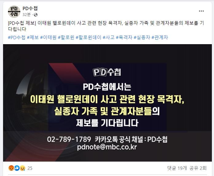 [PD수첩]은 30일 오전 공식 페이스북 계정에 글을 올리고 "이태원 할로윈데이 사고 관련 현장 목격자, 실종자 가족, 당국의 사전 대응 관련 문제점에 대한 제보를 기다린다"고 공지했다.