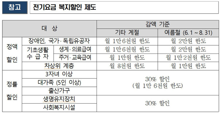 한전은 출산가구 외에 대가족, 3자녀 이상가구 등 정책적 지원대상과 장애인, 기초생활수급자 등 사회적 배려계층의 에너지비용 부담 경감을 위해 전기요금 복지할인 제도를 운영하고 있다.