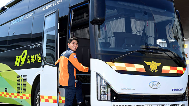 이번 캠페인은 유해 물질에 노출되기 쉬운 대형 화재 진압 현장에서 소방관들에게 편안한 휴식공간을 제공하고 빠른 재충전을 돕기 위해 수소 기술이 탑재된 회복지원 수소전기버스를 기증하는 프로젝트다. 현대차그룹과 소방청, 제주특별자치도 간의 협업으로 진행됐다.