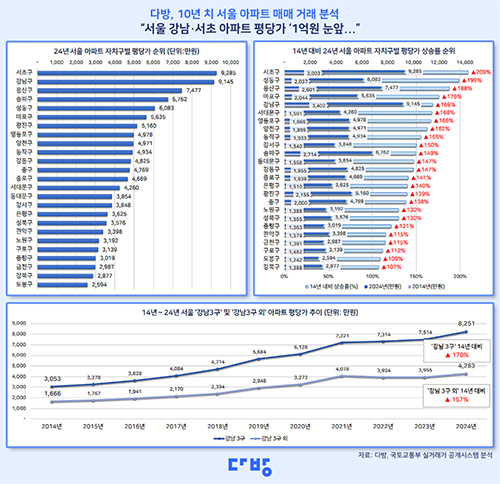 25개 자치구 중 평균 평당가격이 가장 높은 지역은 서초구로 9,285만 원을 기록했는데 10년 전인 2014년(3,003만 원)보다 3배 넘게 증가한 수치다.