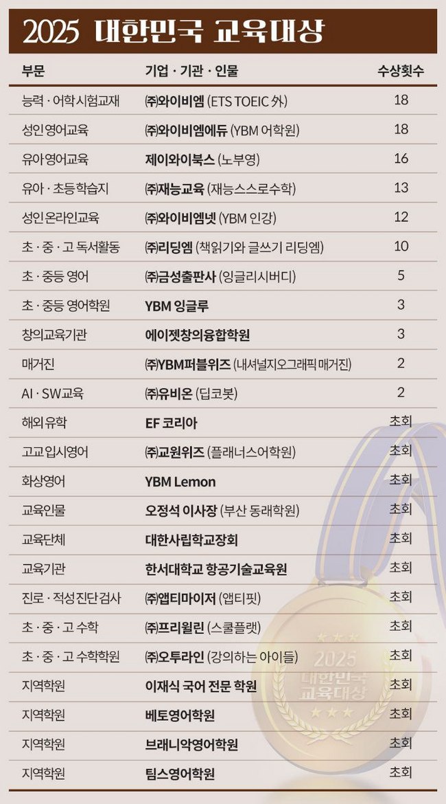 '2025 대한민국 교육대상' 발표…YBM·오정석 이사장 등 수상