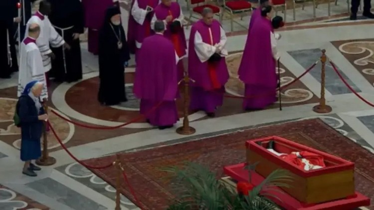 성 베드로 대성전의 이 구역은 전통적으로 추기경과 주교, 사제 등 고위 성직자들에게만 허용되어왔다. 하지만 이 수녀는 안내요원의 도움을 받아 관 가까이 나왔고, 고위 성직자들이 교황에게 마지막 인사를 건네는 동안 한켠에 서서 때때로 눈물을 훔치며 관을 바라봤다.