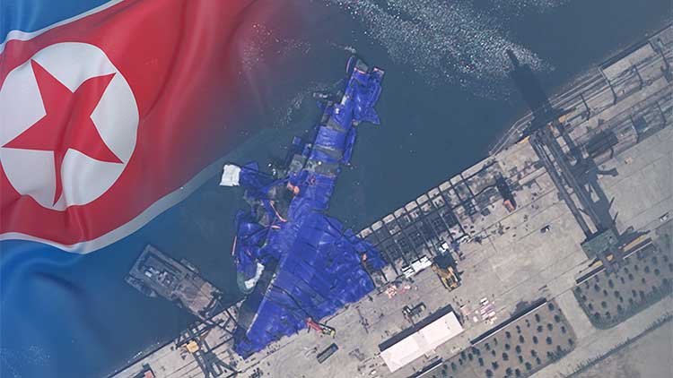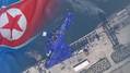 북한이 새로 건조한 5천톤급 구축함이 바다에 반쯤 빠진채 파란색 위장막에 싸여있는 모습이 공개됐다.