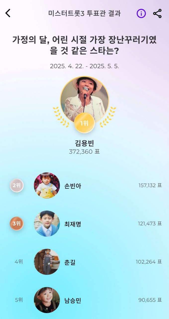 TV조선 인기 오디션 프로그램 '미스터트롯3' 공식 팬덤 투표 서비스 '스타투'에서 가정의 달 5월을 맞아 특별한 키워드 투표가 진행됐다. 이번 투표의 주제는 '어린 시절 가장 장난꾸러기였을 것 같은 스타는?'이다.