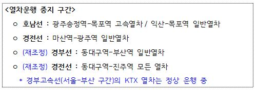 단, 경부고속선(서울-부산 구간)의 KTX 열차는 정상 운행중이다.