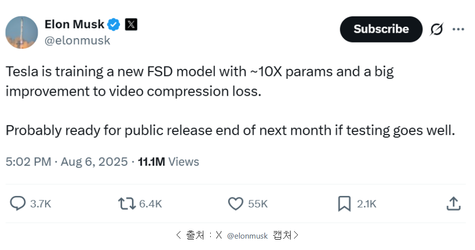 CNBC 방송에 따르면 머스크는 6일(현지시간) 소셜미디어 엑스(X·옛 트위터)에 올린 글에서 "테슬라는 약 10배의 파라미터와 영상 압축 손실을 크게 개선한 새 FSD 모델을 훈련 중"이라면서 "테스트가 잘 진행된다면 다음 달 말에 공개 출시가 가능할 것"이라고 전했다.