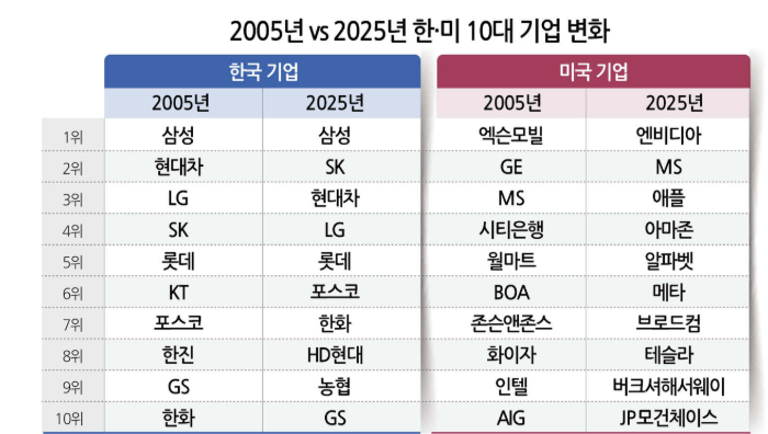 단체 조사에 따르면 미국(시가총액 기준)은 20년 전 엑슨모빌, GE, MS, 시티은행 등이 10대 기업을 차지했으나 지금은 AI를 리드하는 엔비디아, 애플, 아마존, 알파벳 등이 그 자리를 채웠다. MS를 제외하고 모두 바뀐 셈이다. 반면 한국(자산총액 기준)은 삼성, SK, 현대차, LG, 포스코 등으로 거의 변하지 않았다. HD현대, 농협의 10대 그룹 진입이 있었을 뿐이다.