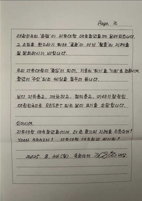 김 전 장관은 서신 말미에서 “보다 자유롭고 깨끗하며 정의롭고 미래지향적인 대한민국을 소망한다”며 “더 큰 용기와 지혜를 달라”는 기도를 덧붙였다. 끝으로는 “YOON AGAIN! 자유대학 애국청년 화이팅!”이라는 구호로 마무리했다.
