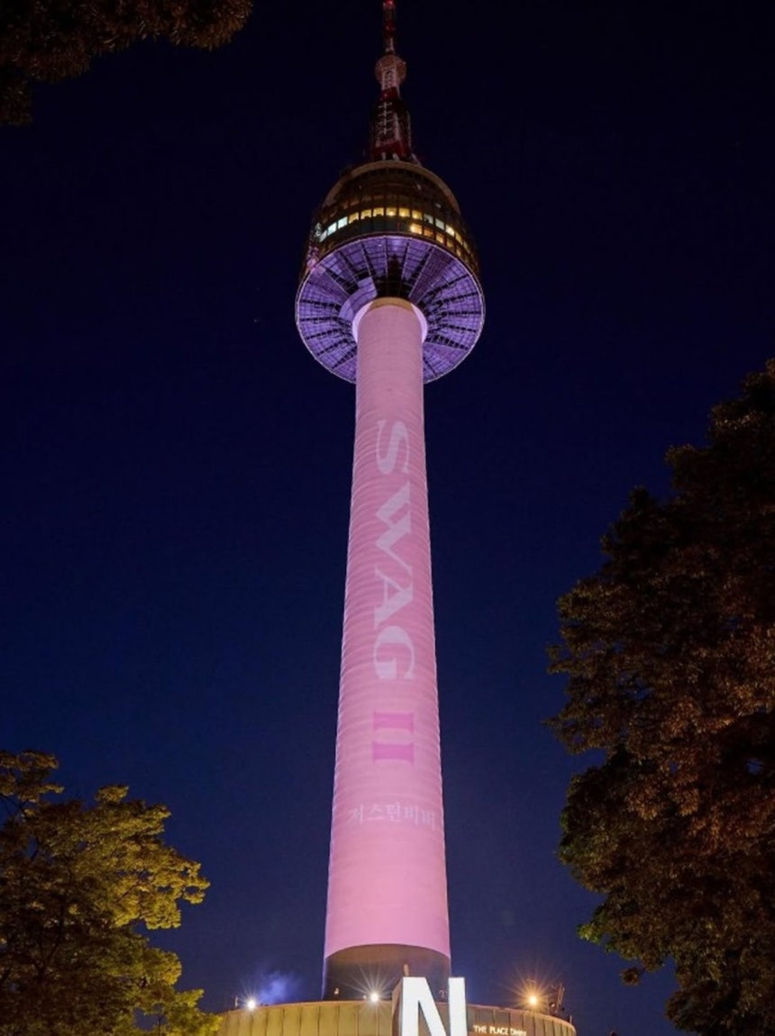 사진 속 남산타워에는 ‘스웨그 II’(SWAG 2)와 ‘저스틴 비버’라는 문구가 핑크빛 조명과 함께 새겨진 모습이었다.
