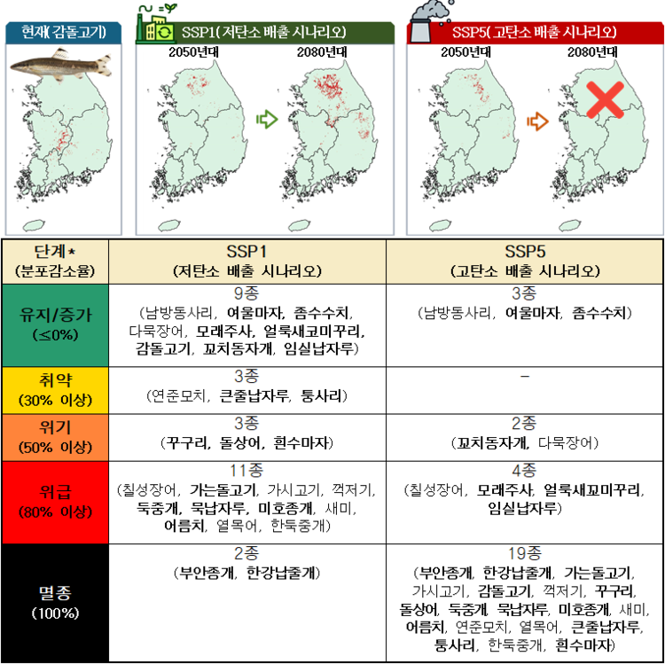 반면, '저탄소 배출 시나리오(SSP1)'로 진행될 경우 2080년 전 세계 온실가스 배출량은 약 33.4기가톤으로 줄어들어 분석 대상 멸종위기 야생생물 어류의 93%(26종)가 생존하는 것으로 예측했다.