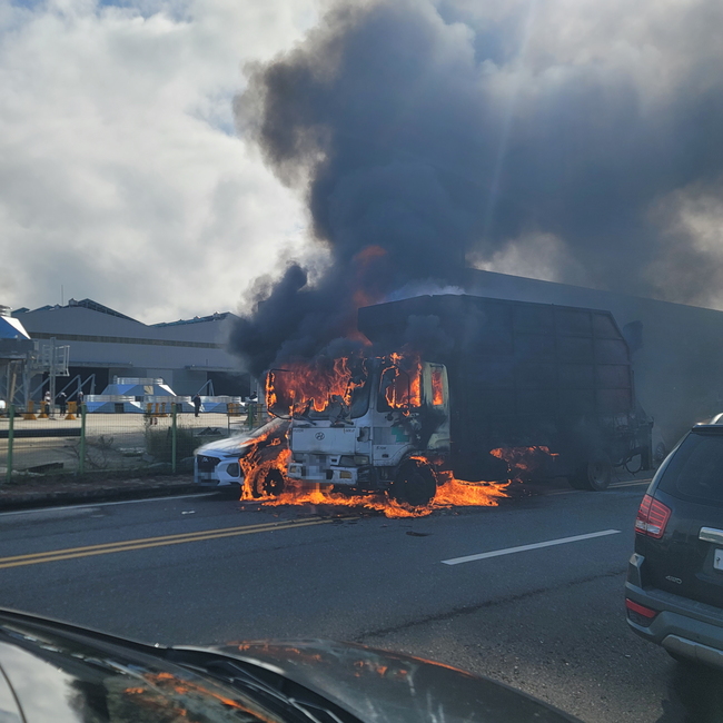 불이 나자 트럭 운전자는 정차한 뒤 대피했다.