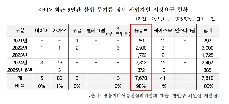 국회 과학기술정보방송통신위원회 소속 한민수 의원(더불어민주당, 서울 강북구을)이 방송미디어통신심의위원회(이하 방미심위)로부터 제출받은 자료에 따르면, 최근 5년간(2021년~2025년 6월) 불법 무기류 정보에 대한 시정요구(삭제 또는 접속차단 요구) 전체 7810건 중 7678건(약 98%)이 유튜브에서 유통된 것으로 나타났다. <표 참조>