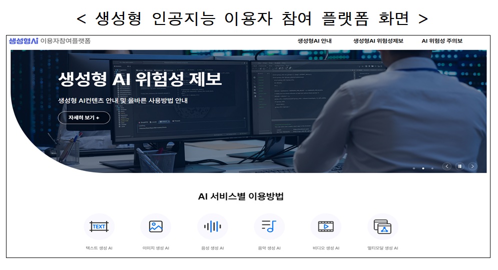 이용자 참여 기반의 소통 창구로 마련된 이번 플랫폼은 ▲이용자가 경험한 위험성?역기능 등 제보 ▲위험성 관련 통계 등 분석자료 주기적 제공 ▲유형별 생성형 인공지능 서비스 이용 방법 및 특성 등 안내 기능으로 구성됐다.