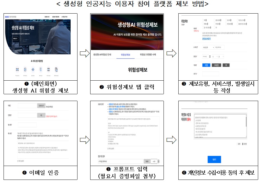 이용자는 생성형 인공지능 서비스 이용 중 발견한 폭력이나 성범죄·성희롱 등 다양한 위험 사례를 이용자 참여 플랫폼을 통해 제보하고, 이는 해당 사업자에게 전달돼 사업자의 자율적인 서비스 개선을 유도한다.