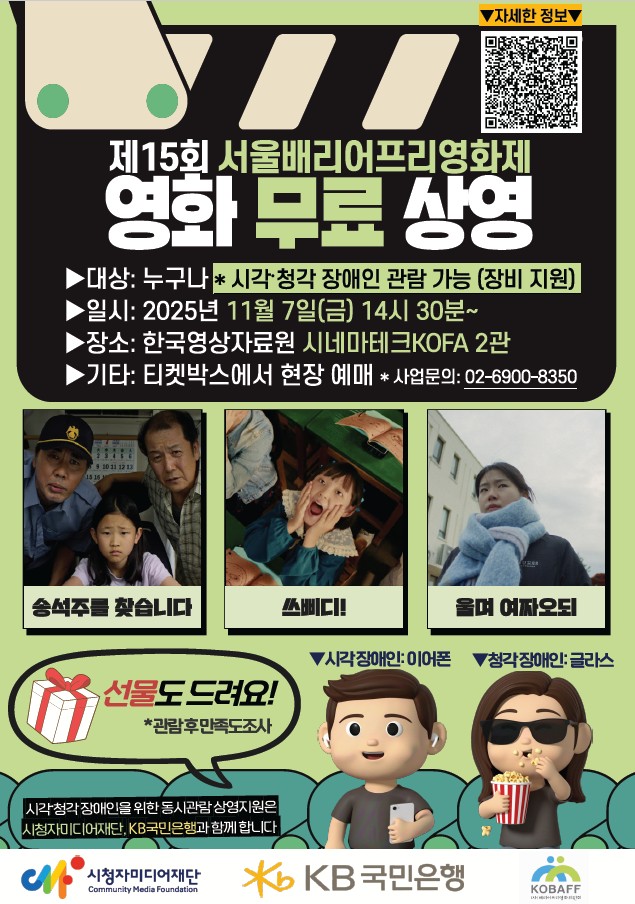 시청자미디어재단(이사장 최철호)과 KB국민은행(대표 이환주)은 (사)배리어프리영화위원회(대표 김수정)와 함께 7일 한국영상자료원(서울시 마포구, 시네마테크KOFA 2관)에서 '배리어프리 영화' 무료 상영을 개최했다.