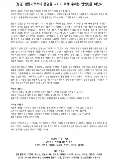 '민언련 활동가 일동'으로 발표된 성명에서 이들은 “구성원으로서 조직을 지키고 싶었기에, 시민단체로서 일말의 민주성을 믿었기에 버텨왔지만 이제 어떤 희망도 볼 수 없다”며 “언론운동의 최전선에서 뜨겁게 활동했던 우리는 이제 스스로를 지키기 위해 떠난다”고 전했다.