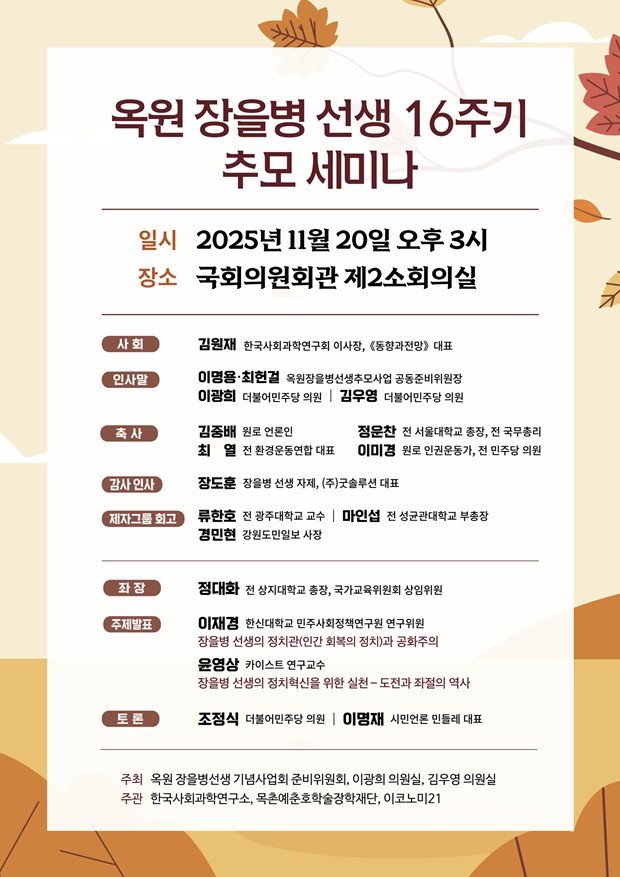 평생을 민주화운동의 기틀을 다지고 시민사회 발전과 정치개혁을 위해 헌신했던 장을병 전 총장의 뜻을 기리기 위해 마련된 이번 세미나는 옥원 장을병선생 추모사업회 준비위원회와 이광희 의원실, 김우영 의원실, 이광희 의원실이 공동주최했다.