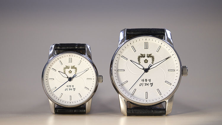 이날 대통령실이 공개한 시계는 다이얼과 시침, 분침이 모두 흰색으로 대통령의 봉황 휘장과 서명이 들어갔다. 강 대변인은 “기획 단계에서부터 디자인 전문가가 참여했다”면서 “시계 앞면은 전통 손목시계와 같이 휘장과 서명이 들어갔고, 전통 태극문양 넣어 심미적 완성도 높였다”고 설명했다.