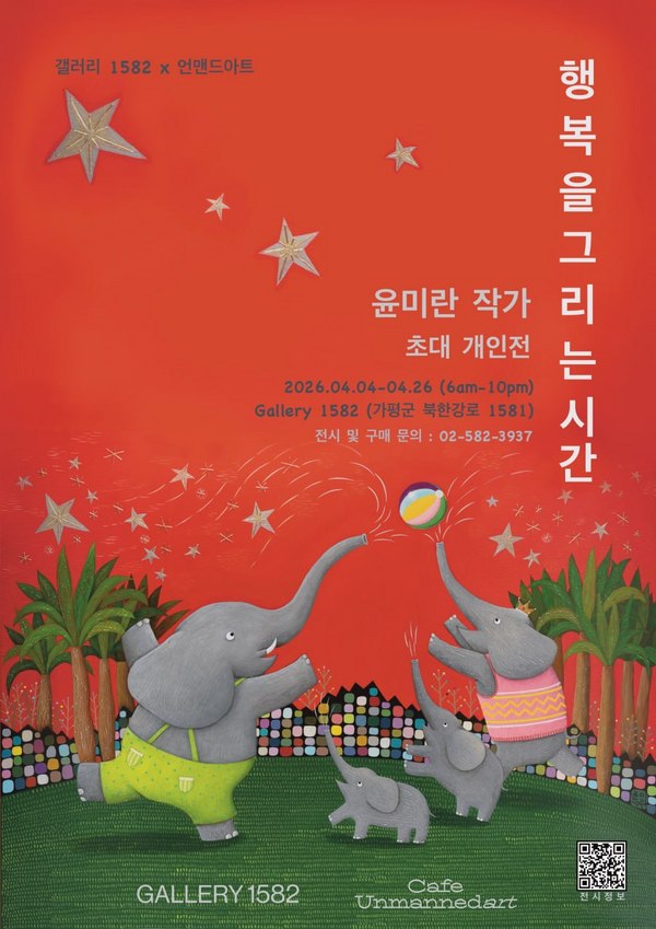 경기도 가평군에 위치한 갤러리 1582에서 윤미란 작가의 초대 개인전 ‘행복을 그리는 시간’이 4월26일까지 열린다. 이번 전시는 빠르게 흘러가는 일상 속에서 놓치기 쉬운 사랑, 설렘, 그리고 조용한 행복의 순간들을 따뜻한 시선으로 담아낸 작업들로 구성된다.