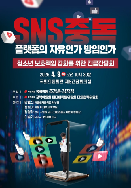 청소년의 SNS 과몰입과 유해 콘텐츠 노출 문제가 심각한 사회문제로 떠오르는 가운데, 알고리즘 기반 플랫폼의 책임을 점검하고 실효성 있는 청소년 보호 대책을 논의하기 위한 긴급간담회가 국회에서 열린다.