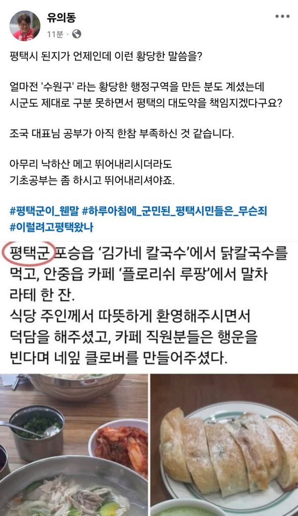 평택군은 1995년 행정구역 개편 때 평택시, 송탄시 등과 함께 통합되면서 '평택시'로 개편됐다. 조 대표가 과거 명칭인 '평택군'을 사용한 셈인데, 해당 글이 확산되자 '평택시'로 수정했다.